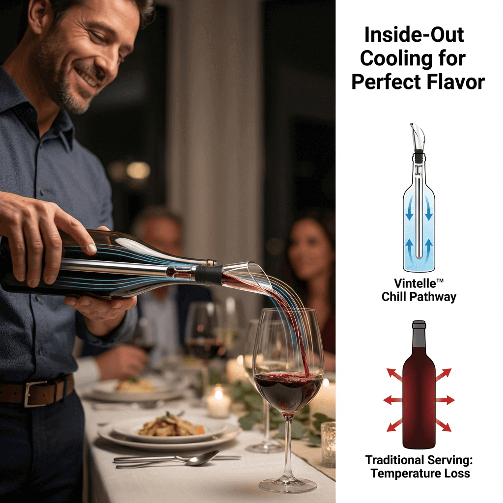 A stainless-steel thermal core chills the wine from within, while a precision spout aerates each pour. The result: smooth, balanced flavor from start to finish.